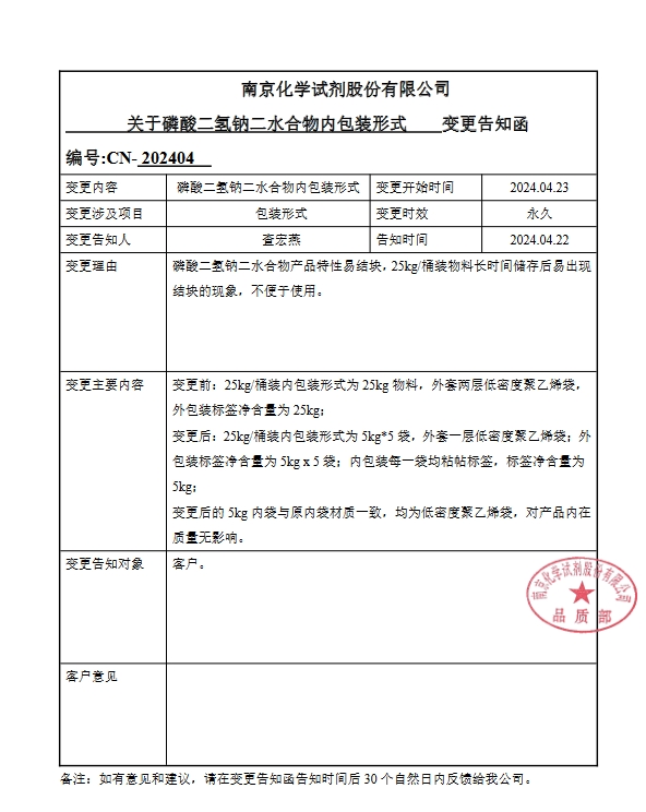 南京化學(xué)試劑股份有限公司:關(guān)于磷酸二氫鈉二水合物內(nèi)包裝形式變更告知函