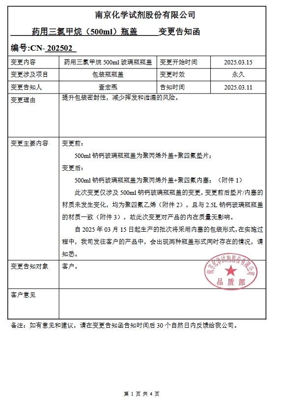 藥用三氯甲烷(500ml)瓶蓋變更告知函:自2025.03.15 正式變更,詳情如下: