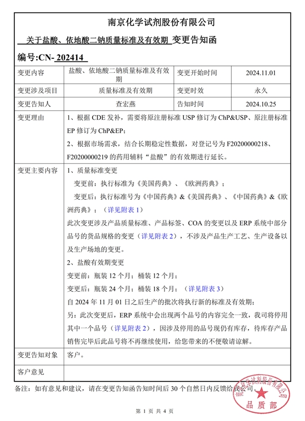 11月1日起,南試鹽酸(USP)/(EP)、依地酸二鈉(USP)質(zhì)量標(biāo)準(zhǔn)變更,鹽酸(USP)/(EP)有效期變更,變更告知函如下!