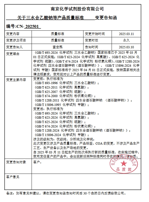化學(xué)試劑三水合乙酸鈉、高氯酸、硫酸、粉狀氧化銅、四水合酒石酸鉀鈉、甲酸等六個(gè)產(chǎn)品質(zhì)量標(biāo)準(zhǔn)更新,此次變更涉及的級(jí)別有優(yōu)級(jí)純純、分析純和化學(xué)純,實(shí)施過(guò)程中會(huì)出現(xiàn)兩種標(biāo)準(zhǔn)號(hào)的產(chǎn)品!變更日期2025年03月11日,詳情如下: