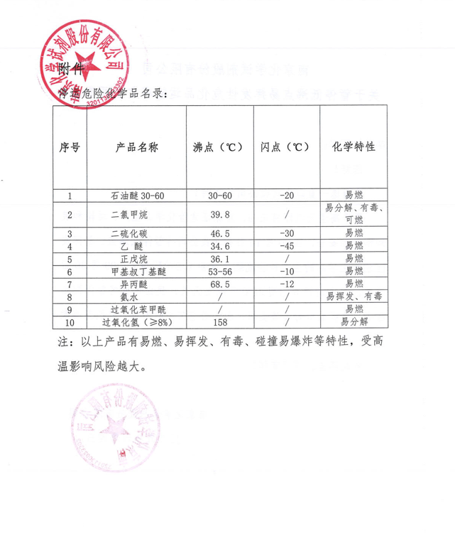 夏季高溫天氣即將來(lái)臨,為保證危險(xiǎn)化學(xué)品生產(chǎn)、運(yùn)輸和裝卸作業(yè)的安全,自 06 月 10 日起,南試公司將暫停低沸點(diǎn)、易揮發(fā)性危險(xiǎn)化學(xué)品的生產(chǎn)和物流配送服務(wù)(名錄附后),預(yù)計(jì) 09 月30日恢復(fù),其余時(shí)段如出現(xiàn) 32℃及以上天氣,我公司也將暫停配送服務(wù)。請(qǐng)請(qǐng)?zhí)崆白龊脗湄洶才?,由此給您帶來(lái)的不便,我們深表歉意。詳情如下: