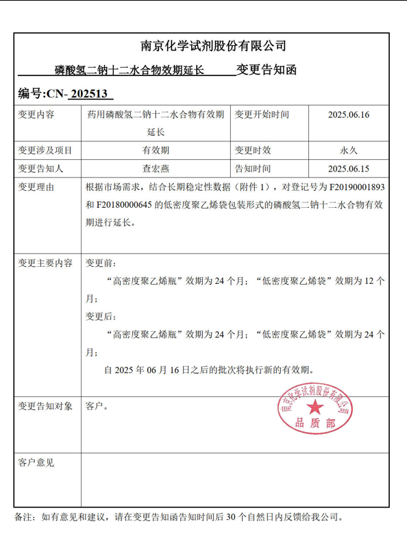 南京化學(xué)試劑:磷酸氫二鈉十二水合物(中國藥典)袋裝有效期由12個月延長至24個月,變更告知函請注意查收!告知函日期之前的批次仍執(zhí)行12個月的有效期。詳情如下: